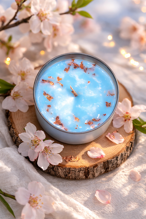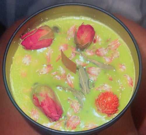 8oz Homemade essential oil candle made with soy wax, wood/wax wick, and dried flowers.